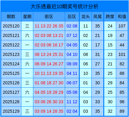其中开出龙头号码为03,凤尾号码为35,跨度数据为32,和值数据为89;后区号码开出02、04,属于偶数+偶数、小数+小数组合号码。