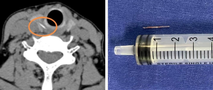 影像结果证实,在刘阿姨右侧甲状腺位置,发现了一条索状的高密度异物影,极有可能是鱼刺穿透食道壁,扎进了甲状腺。