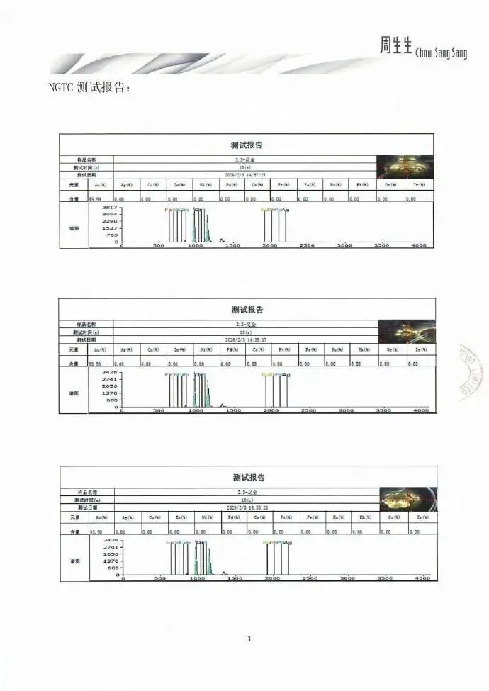 同时,今日2月3日,我司已将同批次同款福袋送检至国家珠宝玉石首饰检验集团有限公司(NGTC),采用X射线荧光光谱法(XRF)进行检测,该福袋货品的检测结论为足金饰品(报告编号:P-ZSSA2121621)。NGTC对该货品随机选取3个检测点,检测所得金含量结果依次为99.99%、99.99%、99.98%(详见下图)。