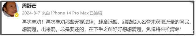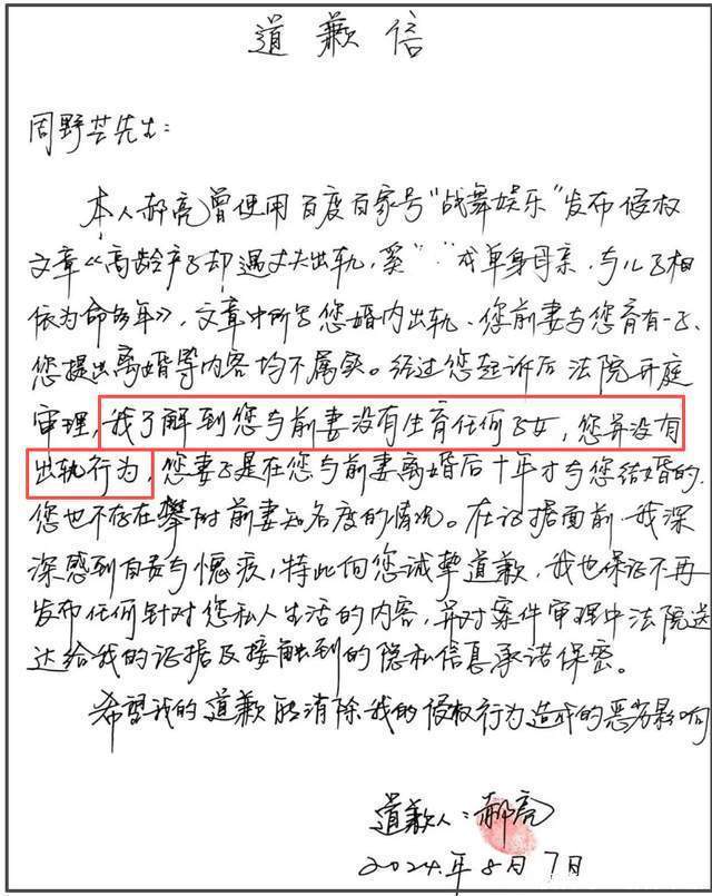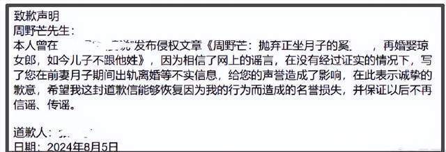 第二封道歉信也是诬陷“周野芒抛妻弃子,再娶新欢,儿子不跟他姓”等,从这些道歉信能看出来,周野芒饱受造谣之苦,现任妻子也被乱写。