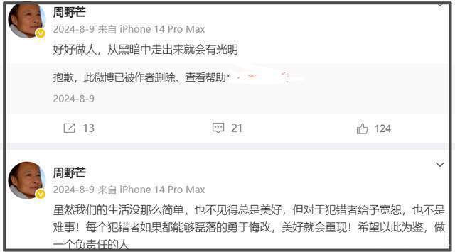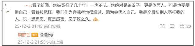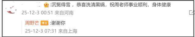 在周野芒最新发布的宣传微博评论区,不少了解事件前因后果的网友纷纷留言安慰,祝福他洗清了多年背负的黑锅,周野芒陆续回复了几条,坦言感谢大家的理解。周野芒的回应,也等于坐实奚美娟带给前夫的伤害。