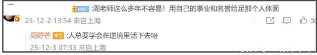 从评论区留言能看出来,很多网友感慨周野芒艰难,佩服他用自己的事业和名誉给了奚美娟体面,但代入自己很难,周野芒大方回应称“人总要学会在逆境里活下去”,这份胸襟气度很厉害,可能也正是这份从容让他忍耐了近30年。