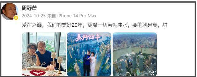 周野芒写道“爱在之巅,我们的美好20年,荡涤一切污泥浊水,要的就是高,甜”,“爱在之巅”就是夫妇俩的高楼合影,而“荡涤一切污泥浊水”则是直接点明过去被泼的脏水,该微博时间发布在造谣者道歉之后,多少能看出周野芒的委屈。