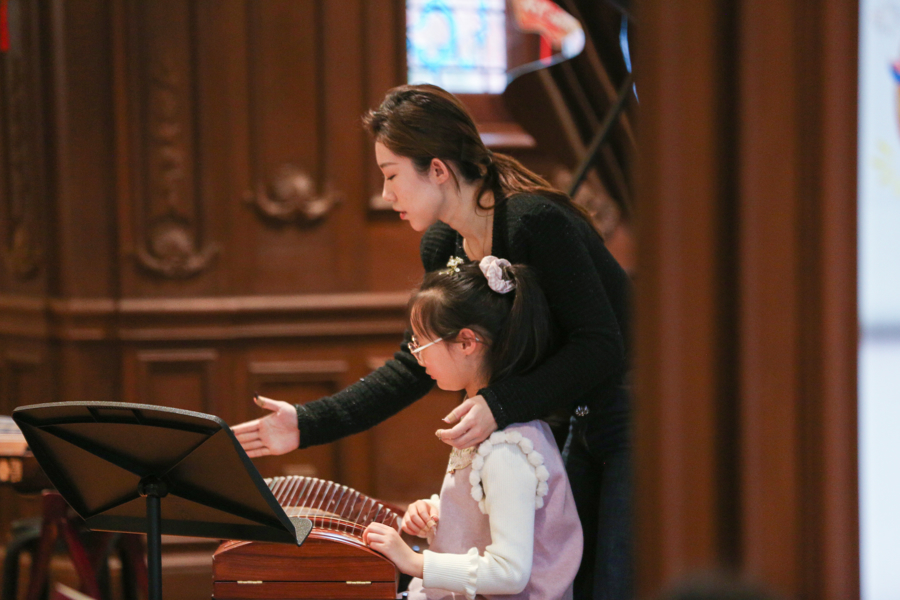 在城市音乐会客厅镜厅内,6名来自钢琴系、民乐系、音乐教育系的学生志愿者先后指导12名中小学生演奏基本曲目。这场“开放式音乐课堂”全程向市民开放,吸引了不少家长和市民围观。上音学生通过艺术实践,以"破墙透绿"的开放姿态,让音乐教育从教室走向城市公共空间,在琴声与童趣的交融中播撒美育的种子。